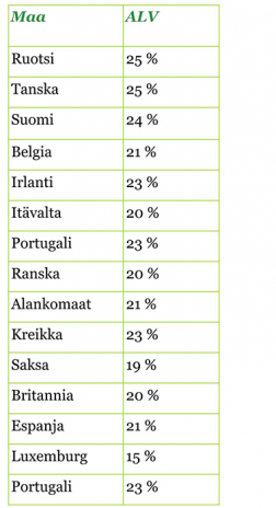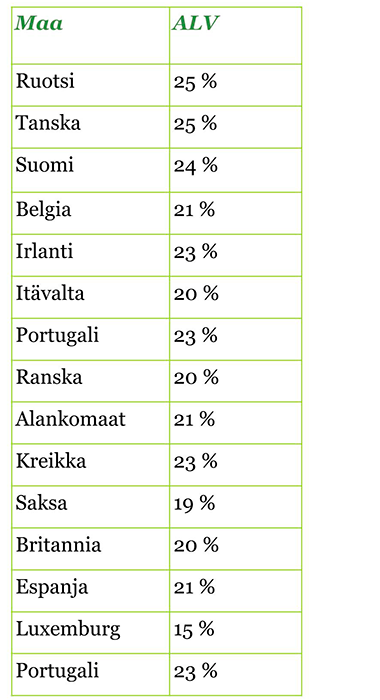EU-maista Ruotsi, Tanska ja Unkari perivät Suomea korkeampaa arvonlisäveroprosenttia (25%). Joidenkin EU-maiden arvonlisäveroprosentit on esitetty oheisessa taulukossa (2014 tilanne).