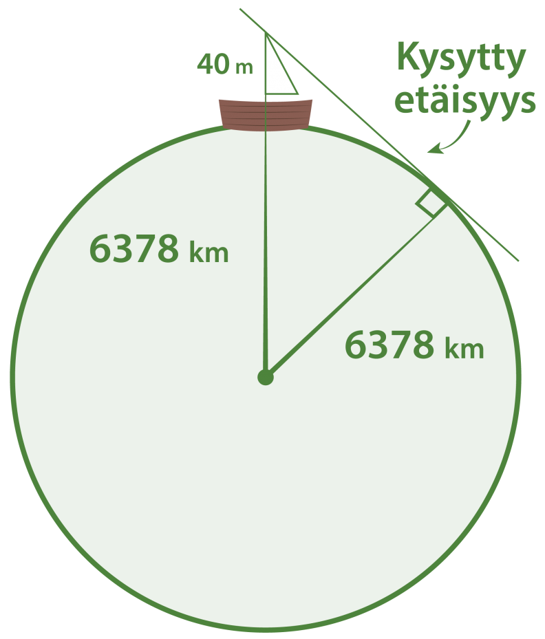 Purjelaivan tähystyskori sijaitsee 40 m korkeudessa. Lasketaan kuinka kauaksi sieltä voi nähdä tyynellä säällä. Maapallon säde on 6378 km. (kuvan mittasuhteet eivät ole oikein).