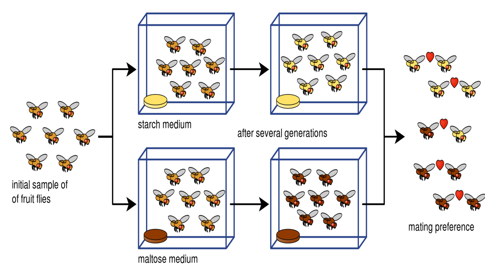 An experiment demonstrating allopatric speciation in the fruit fly (Drosophila pseudoobscura) conducted by Diane Dodd.http://commons.wikimedia.org/wiki/File:Drosophila_speciation_experiment.svg;Public domain. This applies worldwide.