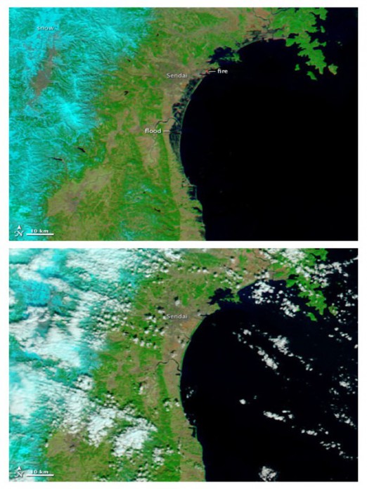 Skies over northeastern Japan were entirely cloud-free on March 13, 2011, providing a clear view of tsunami flooding along the coastline. Water, black and dark blue in these false-color images, still covers the ground as much as five kilometers (three miles) from the coast. The lower image, taken on February 26, 2011, shows the coastline under normal conditions.; By NASA / Goddard Space Flight Center [Public domain], via Wikimedia Commons
