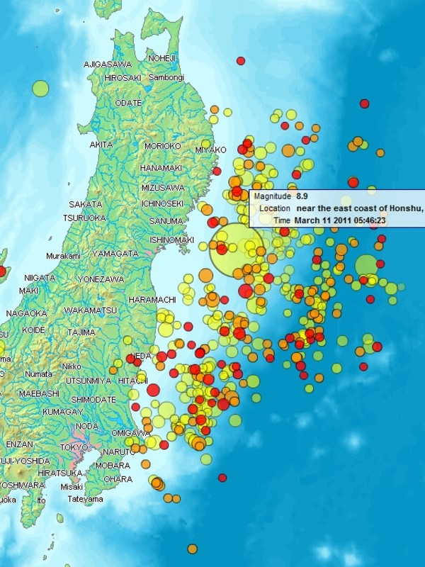 Cropattu kuvasta: Map of the Sendai Earthquake 2011 and aftershocks until March 14, 2011 at 11:20. The size of the circles is a function of magnitude, and the color indicates the date: light green: March 11; yellow: March 12; orange: March 13; red: March 14.;By www2.demis.nl, Uploader User:Heinz-Josef Lücking (http://www2.demis.nl/quakes/) [Public domain, Public domain or CC0], via Wikimedia Commons