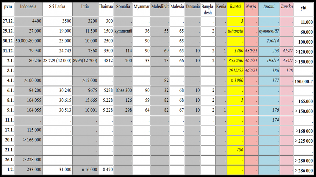 Pohjoismaiden luvuissa on ko. päivänä kadoksissa olleiden määrä/vahvistettujen kuolleiden määrä.
