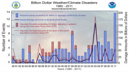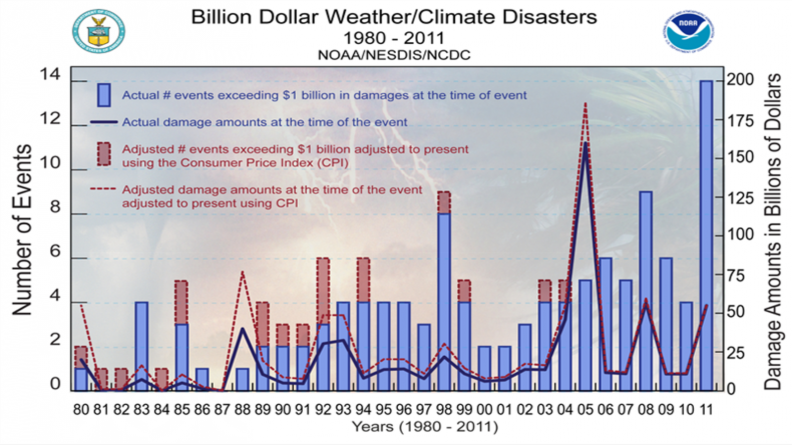 Diagrammi: By National Oceanic and Atmospheric Administration (Extreme Weather 2011) [Public domain], via Wikimedia Commons; “Total extreme weather cost and number of extreme weather events costing more than $1 billion in the United States from 1980 to 2011”