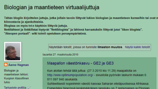 IlmastonmuutosUutisia ja muita nettilähteitä aiheittain Blogijuttuja ilmastonmuutoksestaIlmastonmuutos on monisyinen ja - vaikutteinen asia