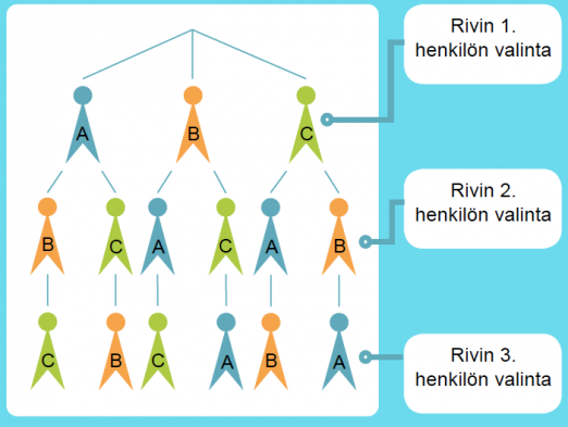 Lasketaan, monellako eri tavalla kolme henkilöä A, B ja C voivat asettua riviin.